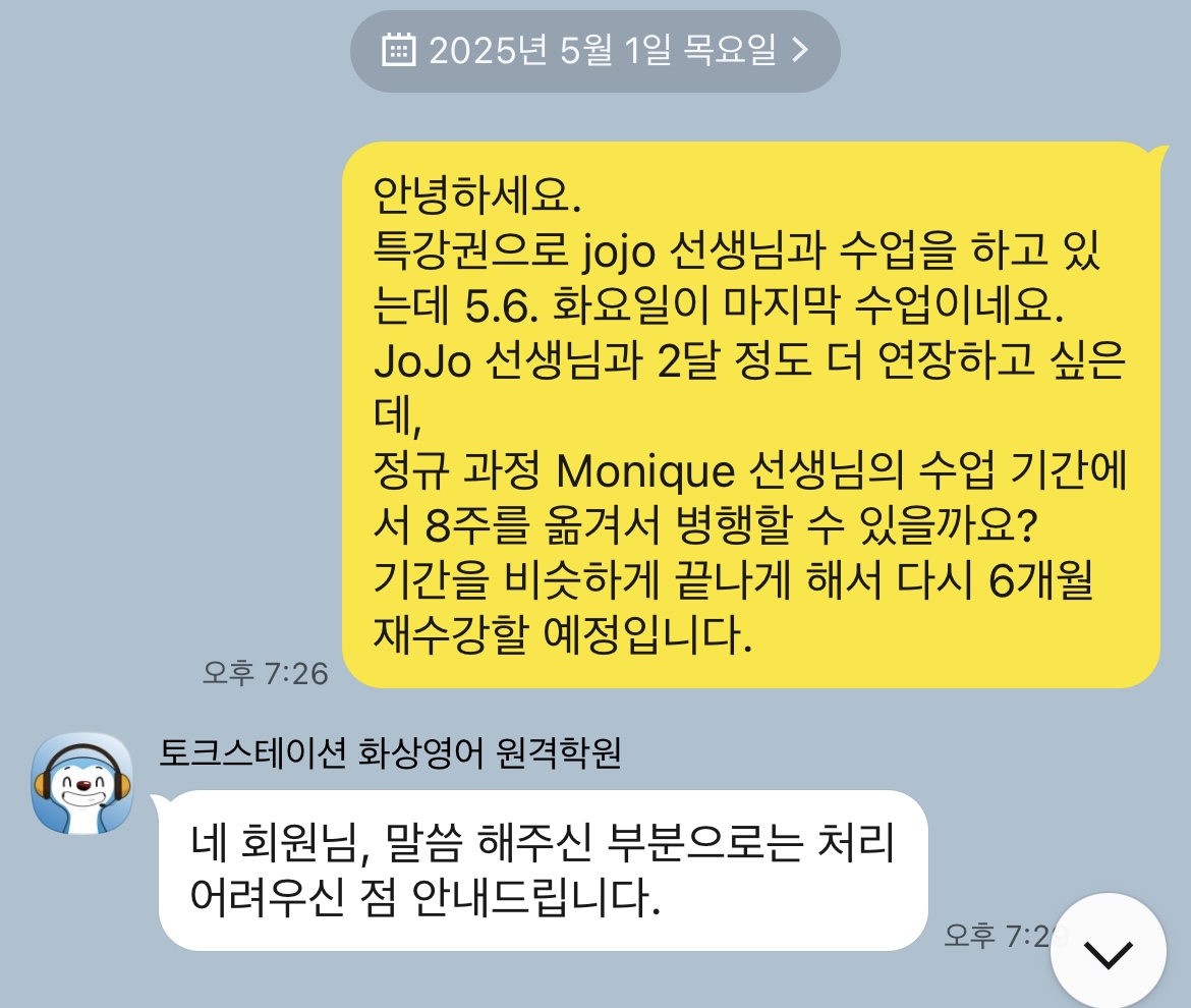 처음 수업을 시작할 때는 아이가 약간 긴장했지만, 선생님이 매우 친절하고 유쾌하게 맞아주셔서 금방 편안해졌어요. 각 수업마다 새로운 단어와 표현을 배우고, 이를 실제 대화에 적용해보는 시간이 있어서 실력이 빠르게 향상되는 느낌이 들었습니다. 선생님은 학생의 수준에 맞춰 수업을 조절해 주시고, 이해가 안 되는 부분은 친절하게 설명해 주시고 발음과 문장으로 정확하게 발화 할 수 있도록 이끌어 주셔서 처음에는 단어 위주로 얘기 했는데 확실히 문장으로 스피킹 하는게 달라지고 자연스럽게 얘기하는게 느껴져요. 수업 중간 중간에 게임이나 퀴즈를 통해 재미를 더해주셔서 지루할 틈이 없어 하네요 수업에 대한 피드백도 즉각적으로 남겨 주셔서 아이가 어떤 부분을 더 개선해야 할지 명확히 알 수 있어요. 토크스테이션 스피킹 수업은 아이의 영어 실력을 키우고 싶은 분들에게 정말 추천하고 싶어요. 재미있고 유익한 수업 덕분에 아이가 영어에 대한 자신감이 생겼고, 수업 시간을 기다릴 정도로 영어 공부를 자연스럽게 받아들이고 좋아해서 정말 만족합니다.