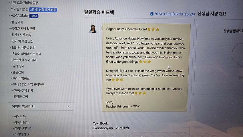 기존 선생님이 그만두셔서 만난 Paulene 선생님과 수업한지 세달 째네요. 선생님이 베테랑이셔서 수업 진행을 원활히 하세요. 매일 수업하니 실력이 많이 늘어난것 같아요. 매일 밤에 수업 중인데 텐션이 좋으셔서 아이가 지쳐하는 순간에도 잘 이끌어주세요. 올해도 아이 실력이 Paulene과 함께 많이 늘어났음 좋겠어요.