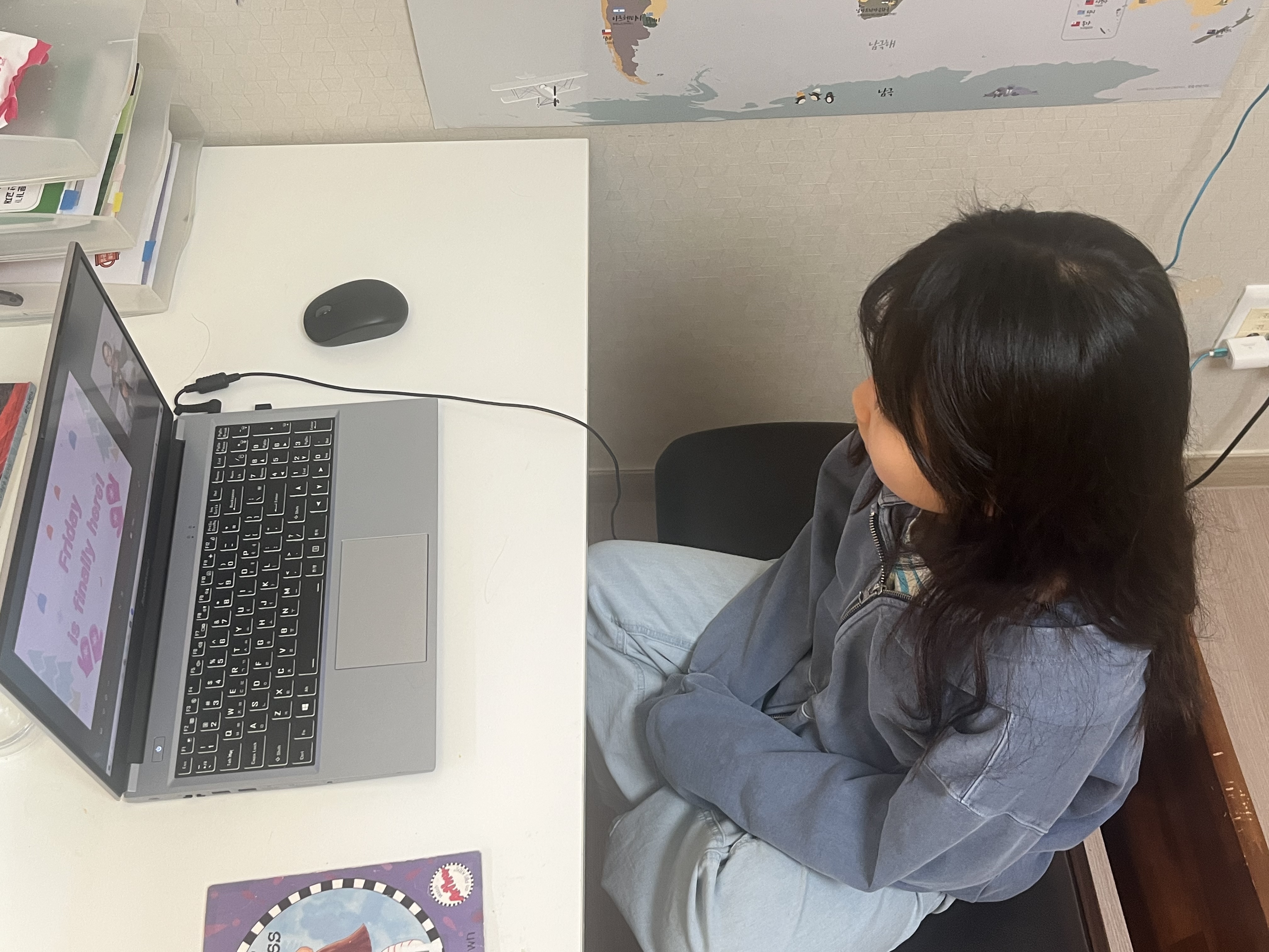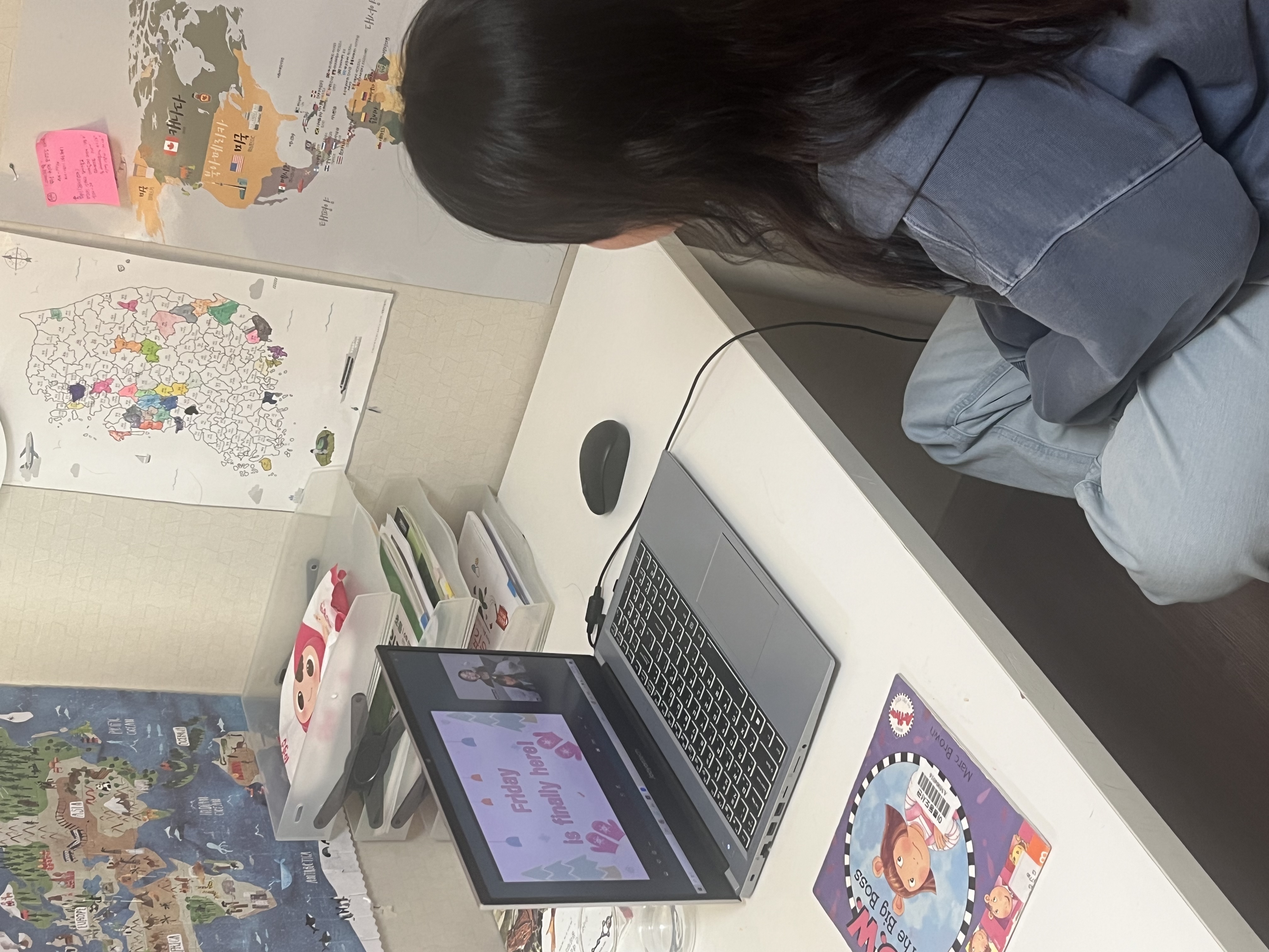 아이가 선생님과의 수업 시간을 좋아합니다.