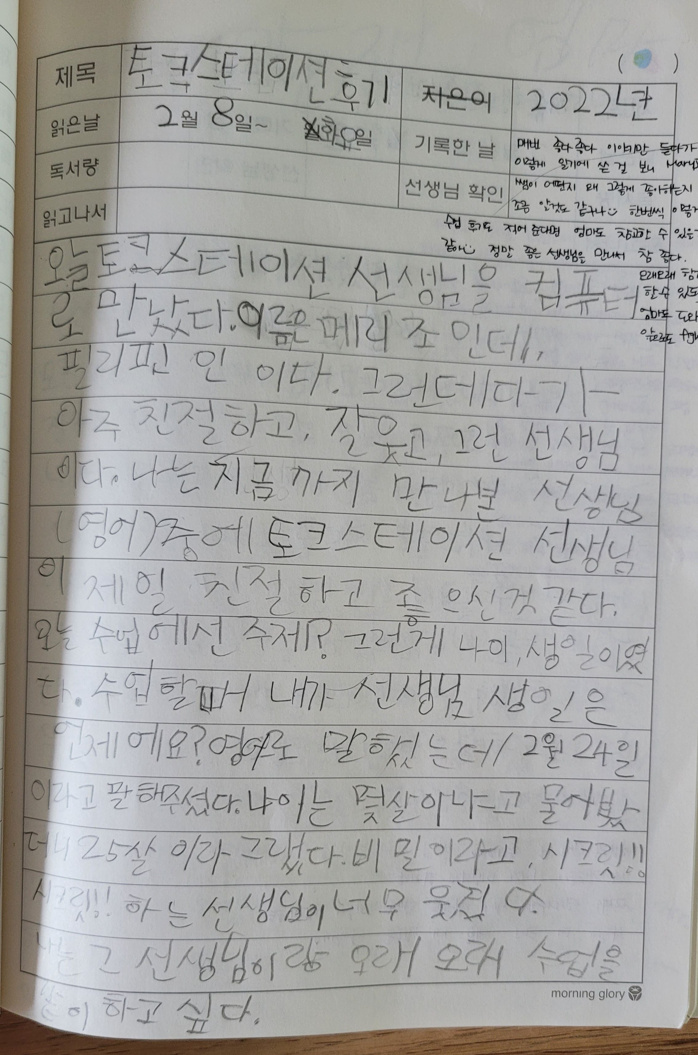 지금까지 진행하는 내내 수업에 즐겁게 참여할 뿐 아니라 가끔 선생님과 대화하고 싶어 궁금한 문장을 물어보며 메모해 가는 아이의 모습을 보면서 아주 큰 만족감을 느낍니다.